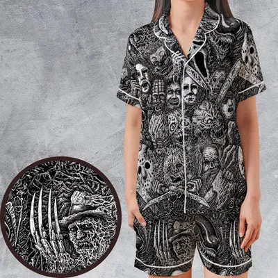 Report - Horror Movie Assemblage Ghostface Xenomorph Pinhead Freddy Michael Myers Satin Short-Sleeve Pajamas Set